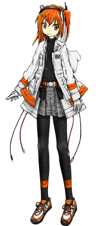 Adachi Rei's frame is a lightweight humanoid figure of androgynous build. She wears clothing over her whole frame, with a black shirt and leggings, a hooded white jacket, a grey skirt closed by a belt, and white gloves. Her primary colors are orange, white, and black, with orange hair and eyes, and several accenting sections in orange. Her design is inspired by Hatsune Miku, with her hair featuring a left-sided ponytail of medium length held by a ribbon and headband, her jacket bearing the number 00, and featuring many technological references (albeit without the futuristic visage of Miku). Her headband has antennas and a lamp.