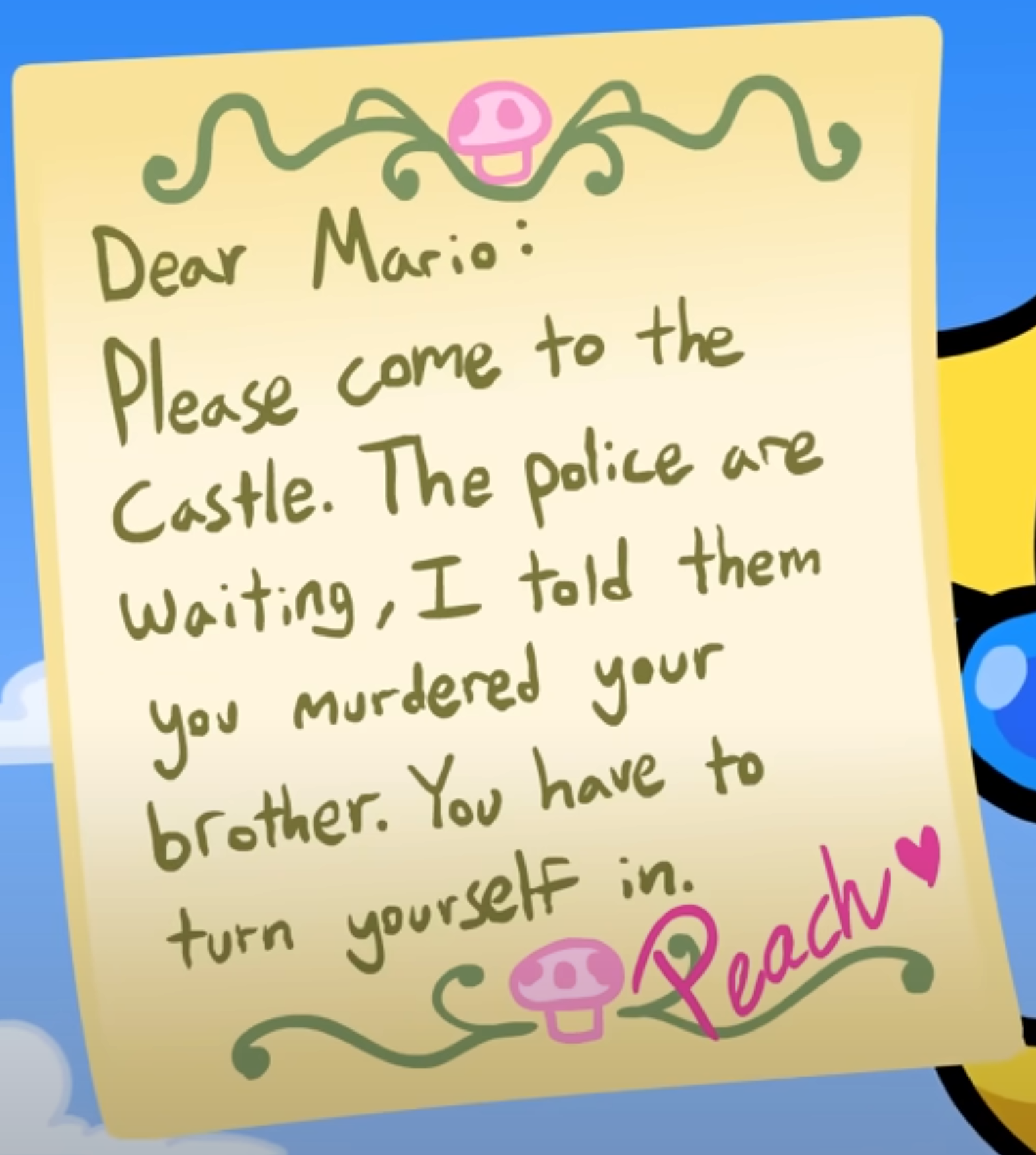 Letter from TerminalMontage SM64 0 Star Speedrun video telling Mario (game) to turn himself in for the murder of his Super Mario Bros (also game)